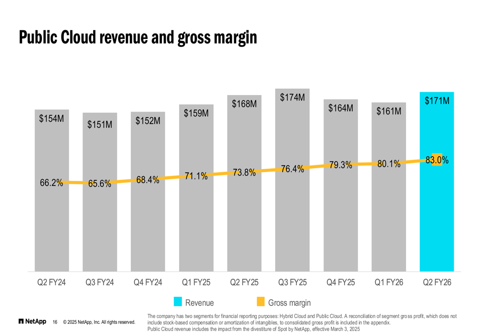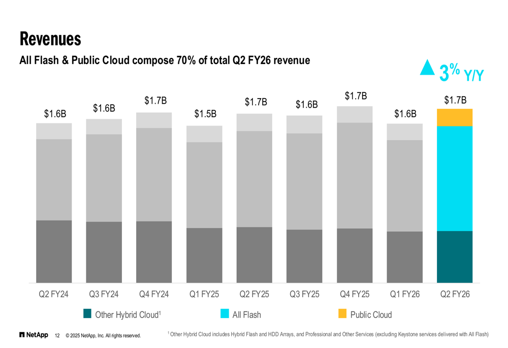 NetApp’s revenue mix continues to shift toward higher-growth segments, with All Flash and Public Cloud solutions now comprising 70% of total revenue. This strategic focus is driving both top-line growth and margin expansion.