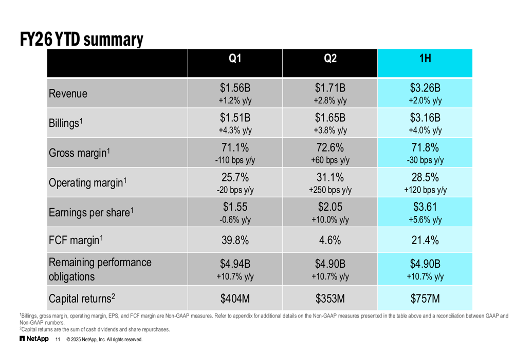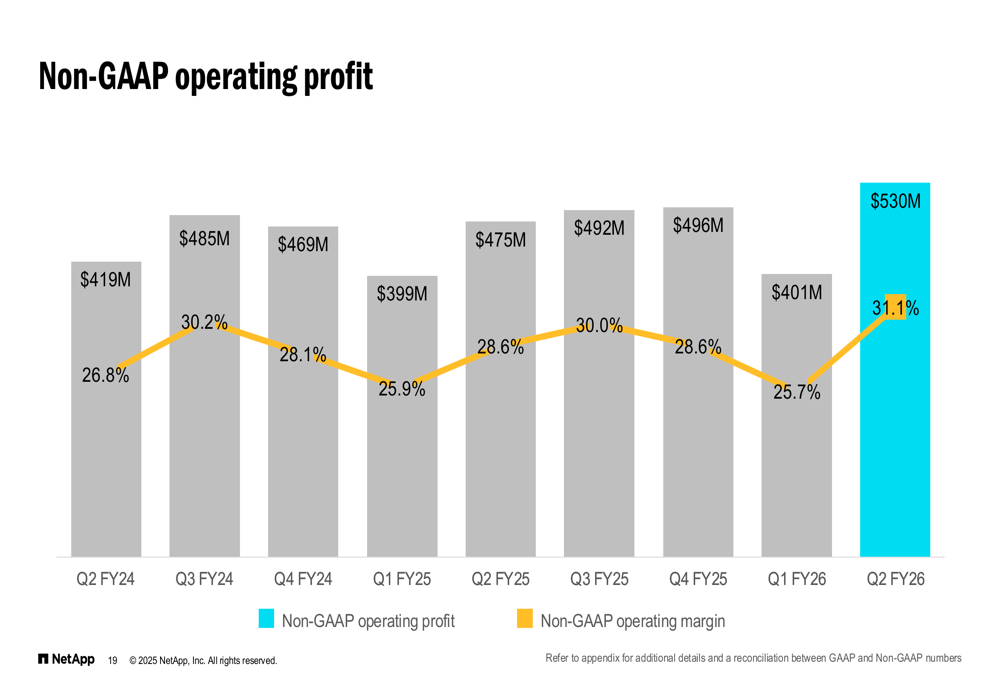 NetApp reported Q2 FY26 revenue of $1.71 billion, representing a 2.8% year-over-year increase and slightly exceeding analyst expectations of $1.69 billion. The company achieved record quarterly operating margin of 31.1%, a substantial improvement of 250 basis points from the same period last year.
