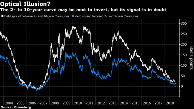 The spread between shorter- and longer-maturity Treasury yields is close to the narrowest since 2007, and sections of the front end of the curve have already turned negative. Another couple of Federal Reserve interest-rate hikes -- one of which is expected Wednesday -- may extend that inversion. But while slowing growth and market turbulence have sharpened the market’s focus on recession risks, it’s too soon to read that signal from the curve, strategists say.